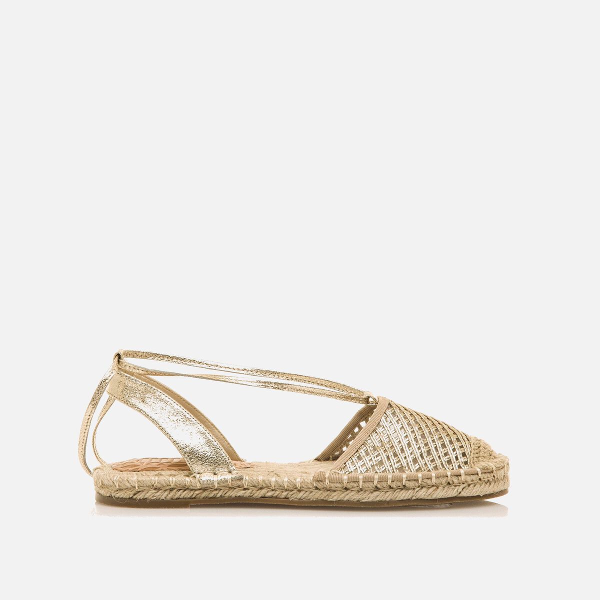 Women's golden flat sandals by Mtng, model Arenal. These sandals combine a jute sole with a braided design on the front. The crossed straps wrap around the ankle for added support. Stand out with Arenal by Mtng!